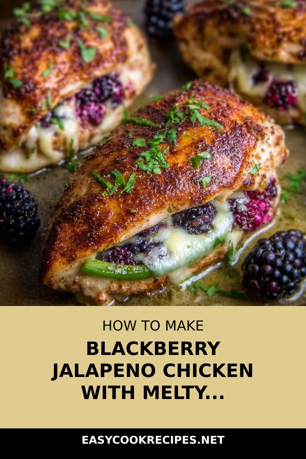 “Melty Blackberry Jalapeno Chicken: Creamy cheese, juicy chicken, and a sweet-hot hit from ripe blackberries and jalapenos make every bite perfectly balanced.”