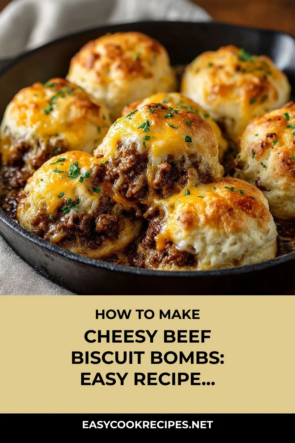 Indulge in Cheesy Beef Biscuit Bombs: golden, crispy biscuit pockets bursting with creamy beef and cheese, perfect for a fun weeknight meal or entertaining a crowd.