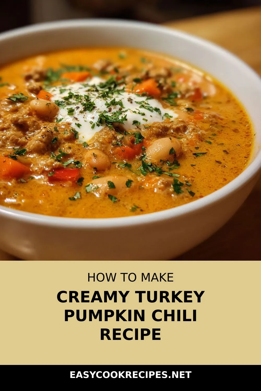 “Indulge in cozy comfort with this Creamy Turkey Pumpkin Chili, a velvety blend of lean turkey, white beans, and pumpkin puree with a touch of gentle spices.”