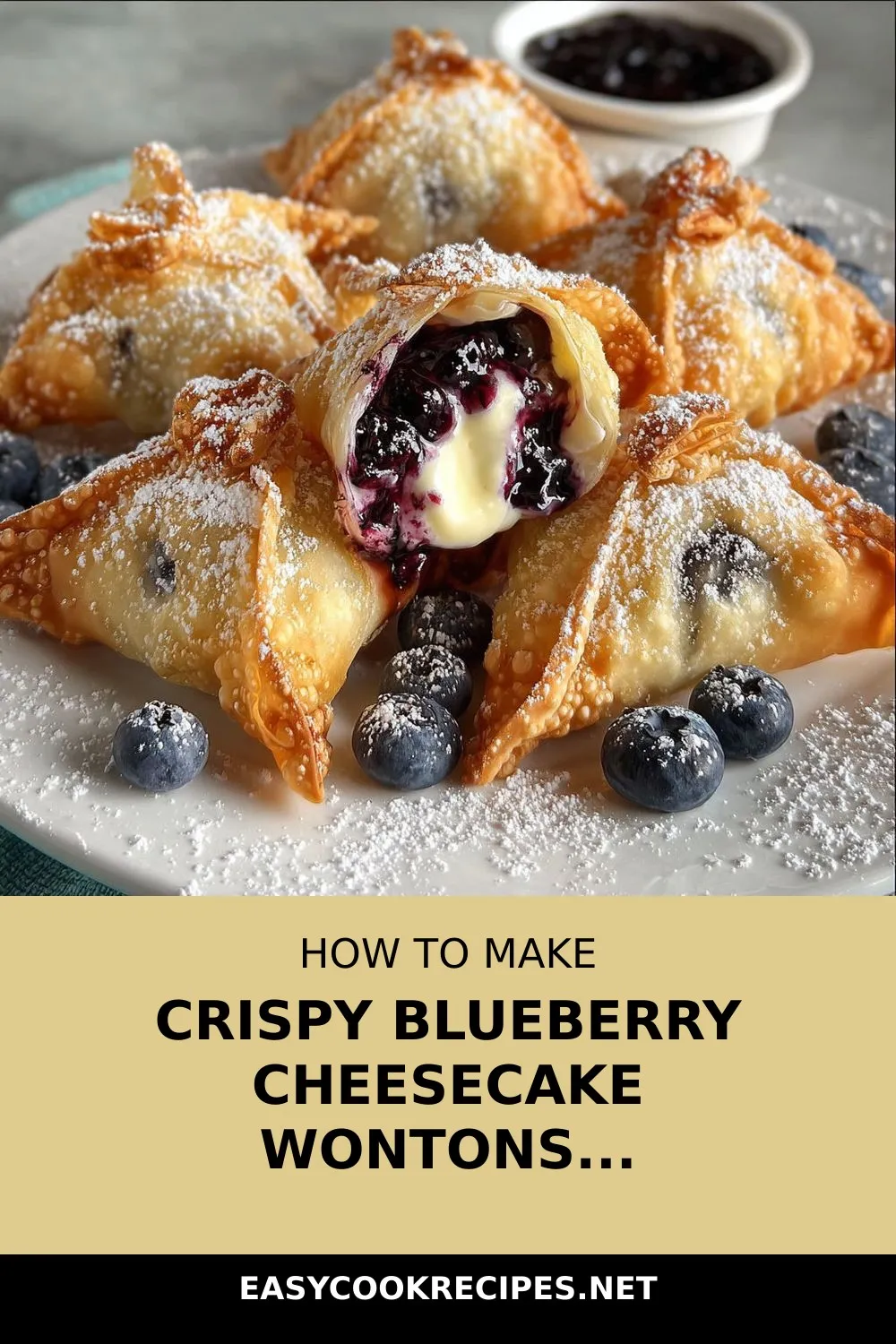 When making the wontons, remember to seal the edges tightly with beaten egg and avoid overfilling to ensure the filling stays secure during frying. Use a neutral oil with a high smoke point, such as vegetable, canola, or peanut oil, for the best frying results. If you want to prepare ahead, assemble the wontons and refrigerate them until you are ready to fry and serve, maintaining that perfect crispy texture. Finally, feel free to customize the presentation by topping the wontons with extra blueberry sauce, powdered sugar, whipped cream, or a scoop of vanilla ice cream for a delightful finishing touch.