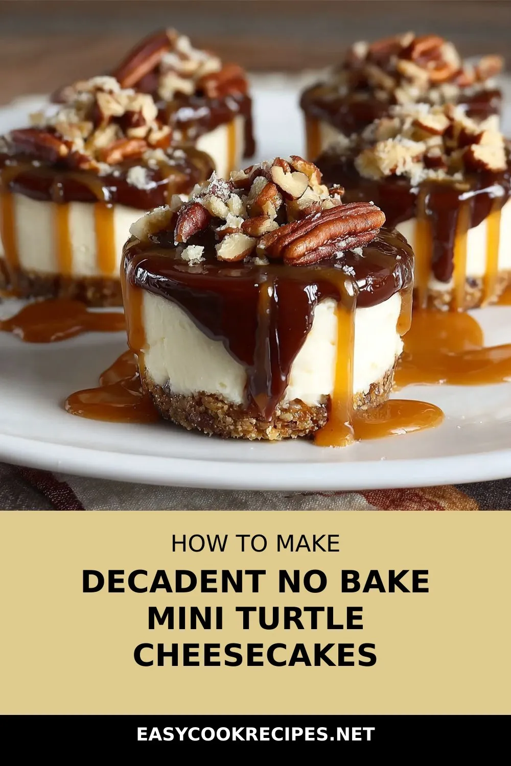 Indulge in rich and creamy No Bake Turtle Mini Cheesecakes, a decadent treat with layers of caramel, pecans, and cream cheese.
