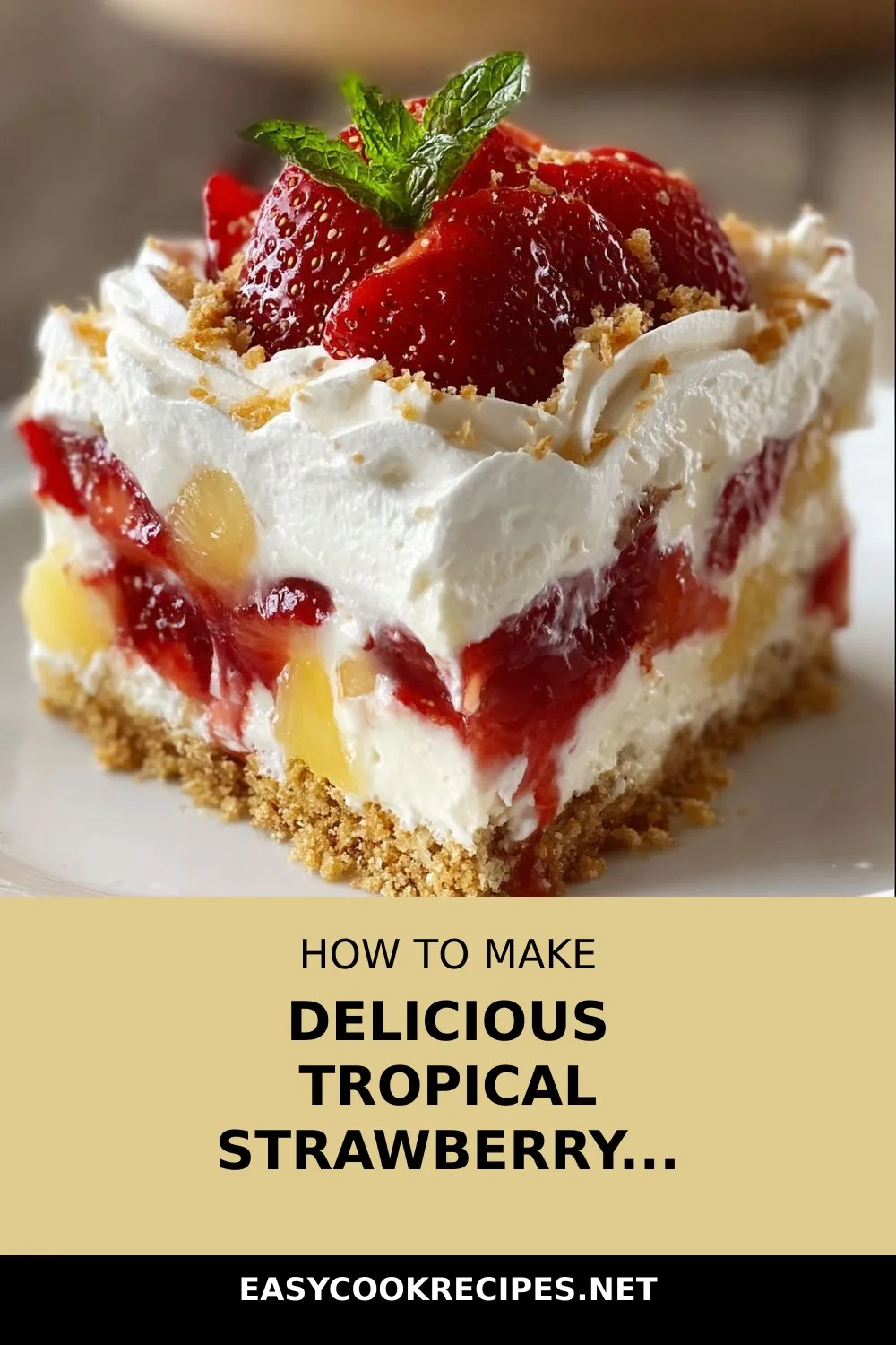Transport yourself to a tropical paradise with every forkful of this delightful dessert. Easy to make and even easier to enjoy, this Tropical No-Bake Strawberry Split Cake is a must-have for any occasion. So, whip up a batch, chill it well, and get ready to savor a taste of summer in every bite.
