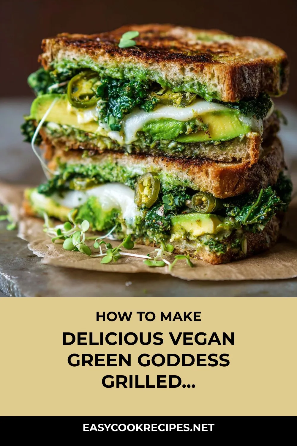 - This Vegan Green Goddess Grilled Cheese is packed with vibrant greens, zippy pesto, creamy avocado, and spicy jalapeños, creating a flavorful and satisfying combination in every bite.