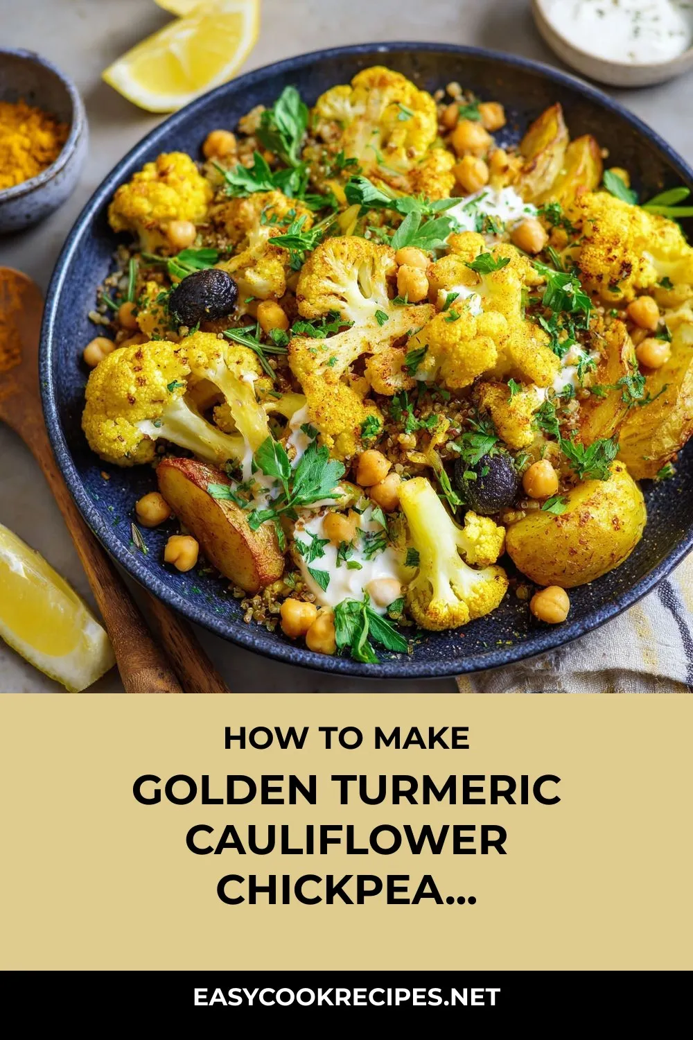 Golden Turmeric Cauliflower Chickpea Bowl with roasted veggies, olives, and a lemony marinade, served with grains and yogurt—a vibrant, aromatic, and irresistible meal.