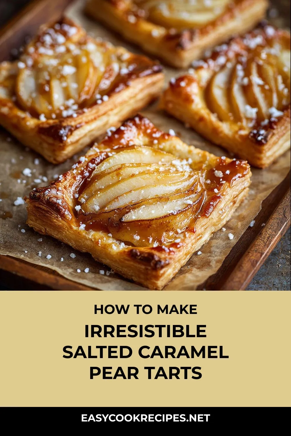 Elegant and easy-to-make Salted Caramel Pear Tarts: flaky pastry, ripe pears, and a caramel sauce with a sprinkle of sea salt.