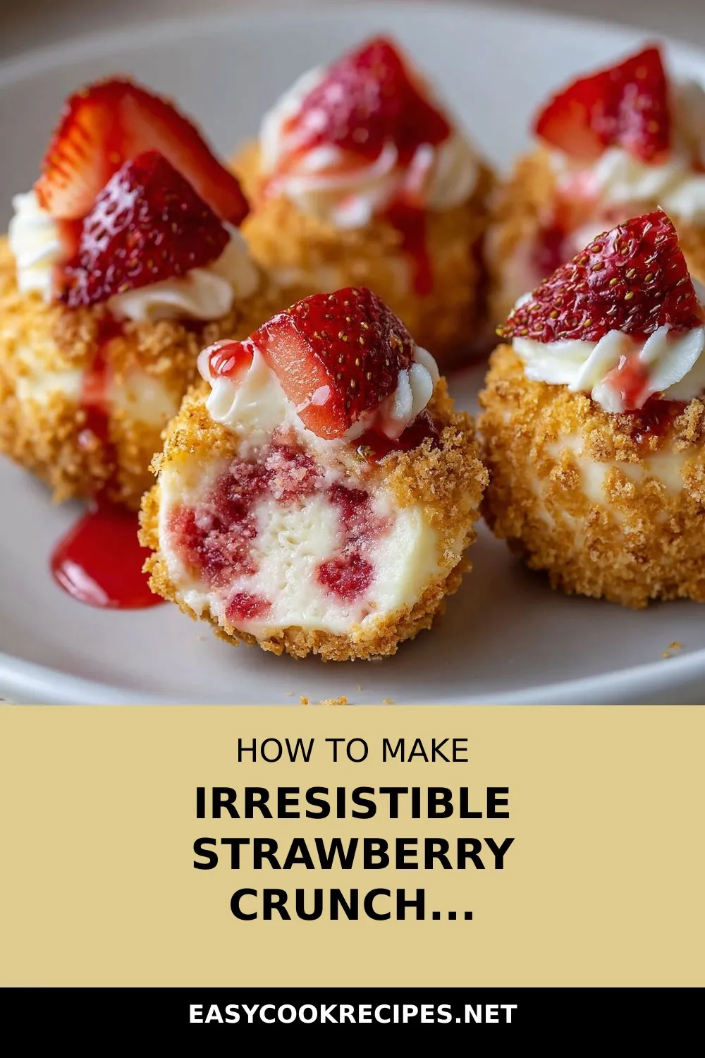Indulge in Strawberry Crunch Cheesecake Bites, a delightful blend of creamy cheesecake, fresh strawberries, and a crumbly cookie crust topped with a playful strawberry crunch.