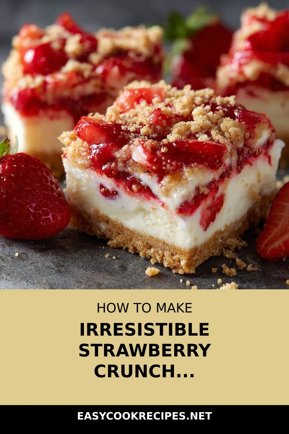 When serving the Strawberry Crunch Cheesecake Delight, chill it thoroughly for the best texture and flavor. The cheesecake slices are perfect for picnics as they travel well. Enhance each piece with whipped cream or fresh berries for a delightful touch. For special occasions, arrange the bars on a cake stand with edible flowers for an elegant presentation.