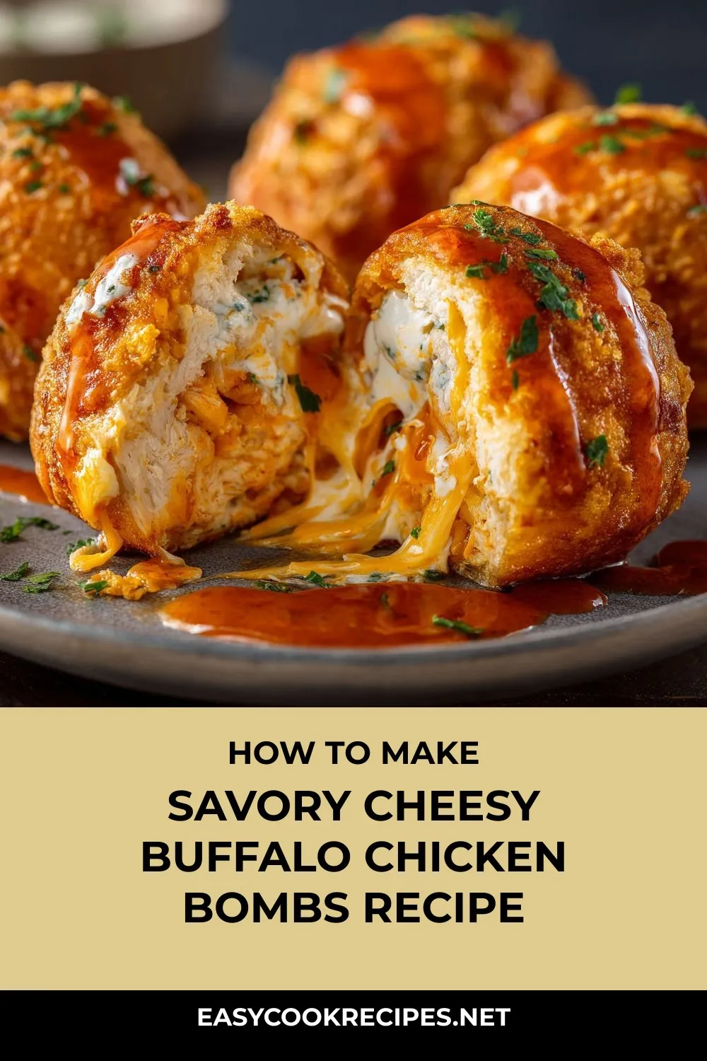“Cheesy Buffalo Chicken Bombs – a savory blend of buffalo chicken, gooey cheeses, and warm biscuits, perfect for game nights and parties!”
