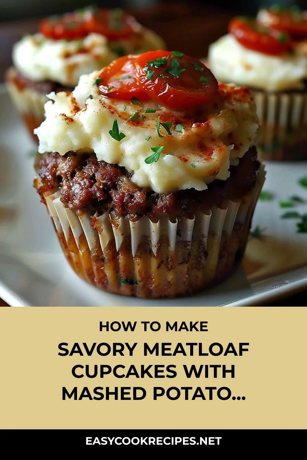 6. Frost and Garnish: Pipe or spoon whipped potatoes on top of each meatloaf cupcake. Garnish with a small piece of cherry tomato and fresh parsley or chives.