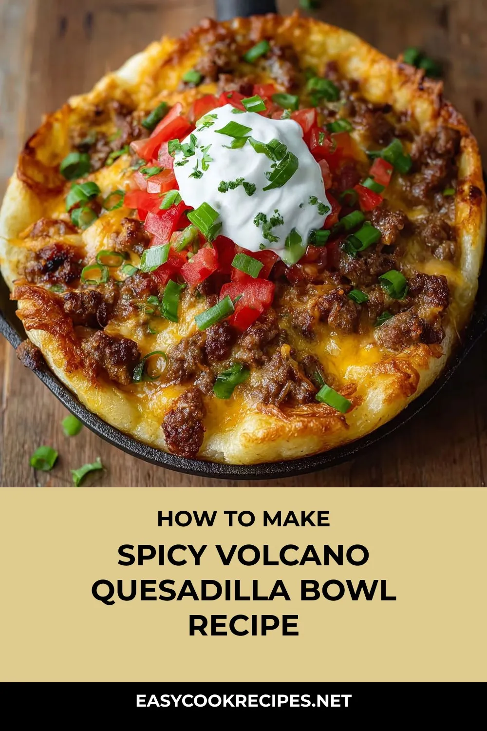 “Indulge in a bubbling, meaty Volcano Quesadilla Bowl – a crispy tortilla filled with spicy beef and gooey cheese, perfect for movie nights or casual get-togethers.”