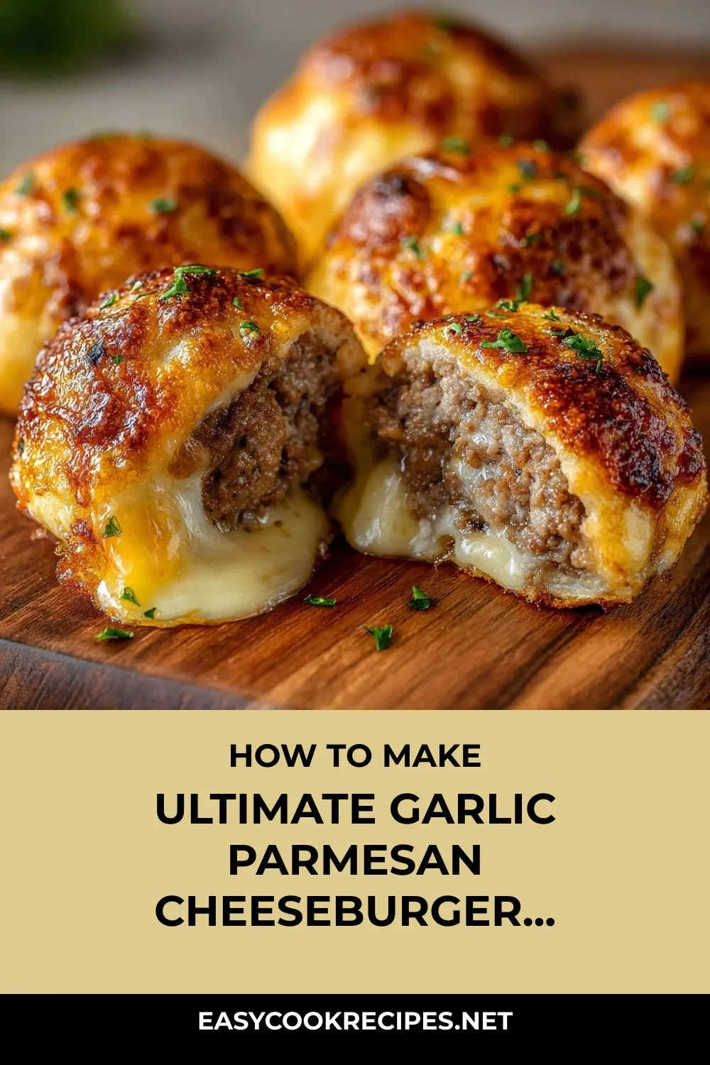 “Garlic Parmesan Cheeseburger Bombs: savory ground beef, gooey cheese, and garlicky dough, a perfect party snack or cozy dinner option.”