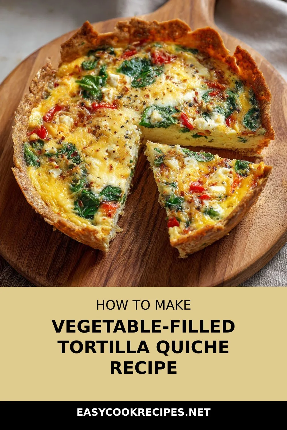 “Wholesome tortilla quiche with a crispy crust filled with creamy eggs, fresh veggies, and melty cheese – a versatile and easy one-pan meal for any time of day.”